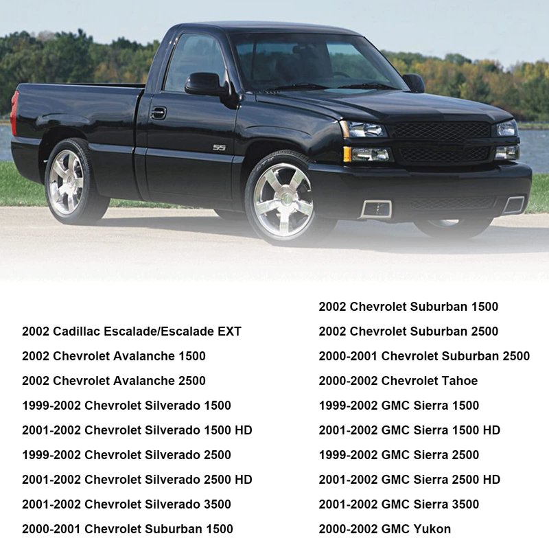 - 【Compatible with】1999 2000 2001 2002 Chevrolet Silverado 1500/ 2500, 2001 2002 Chevrolet Silverado 1500HD/ 2500HD, 2001 2002 Silverado 3500, 2002 Avalanche 1500/ 2500, 2000 2001 2002 Chevy Suburban 1500/ 2500, 2000 2001 2002 Tahoe.