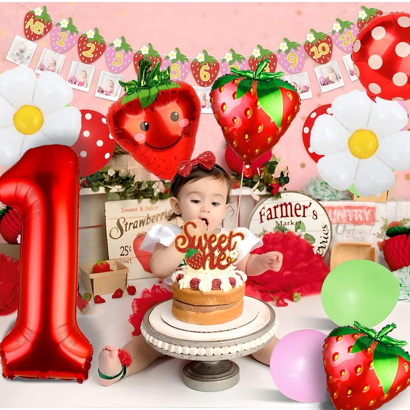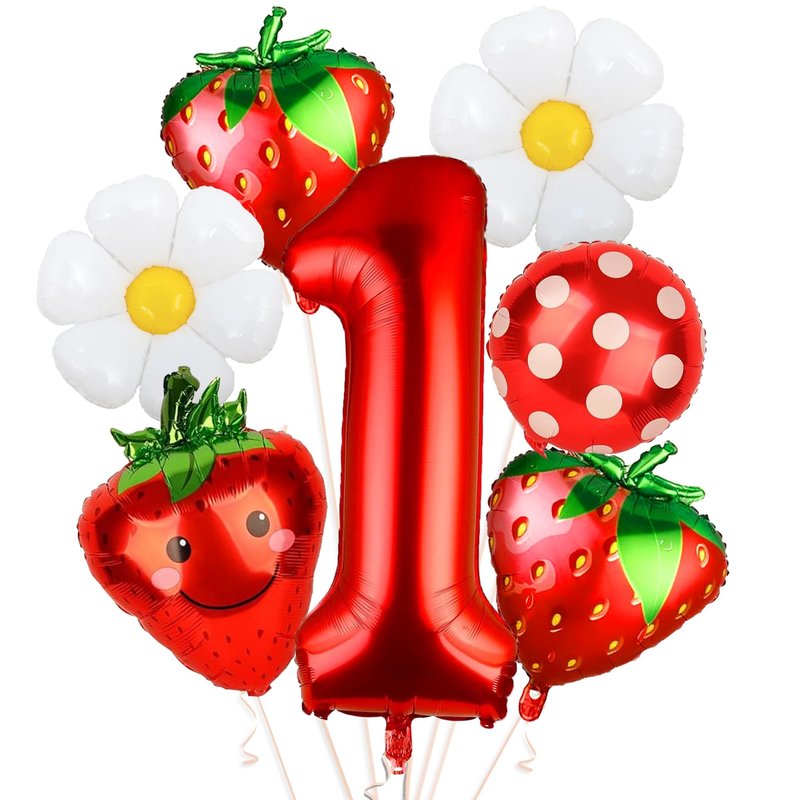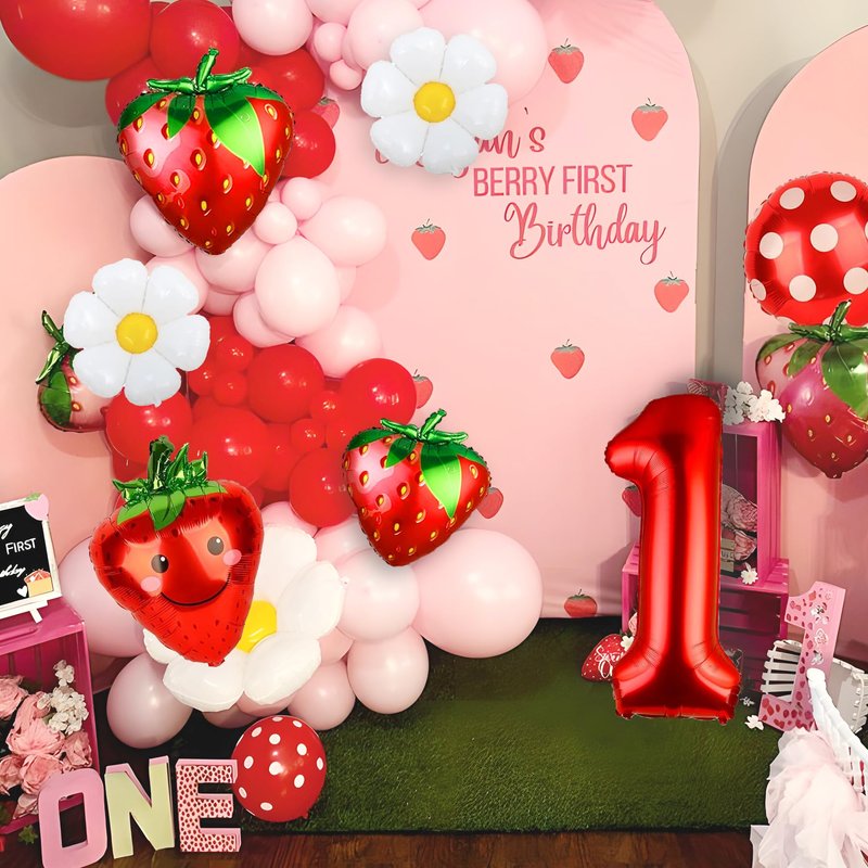 - Large Size: 7 Pieces in one package. There is one 40inch red balloon(Numer one), three 18inch balloons(2*daisy and 1*Polka dot balloon ), three 24 inch strawberry balloons, Wonderful berry first birthday decorations for baby's one year old birthday party.