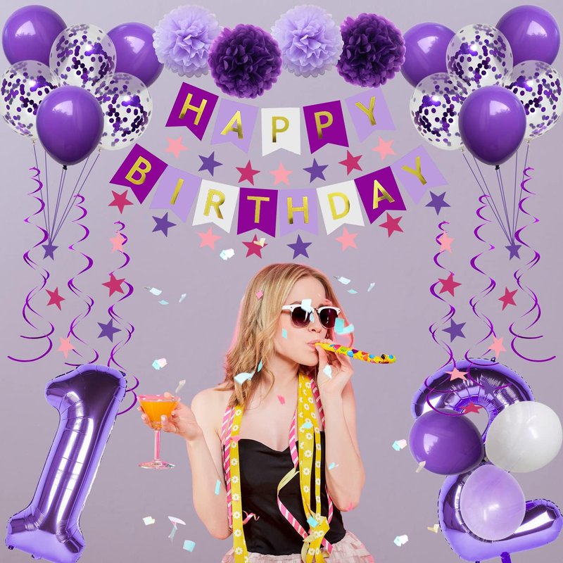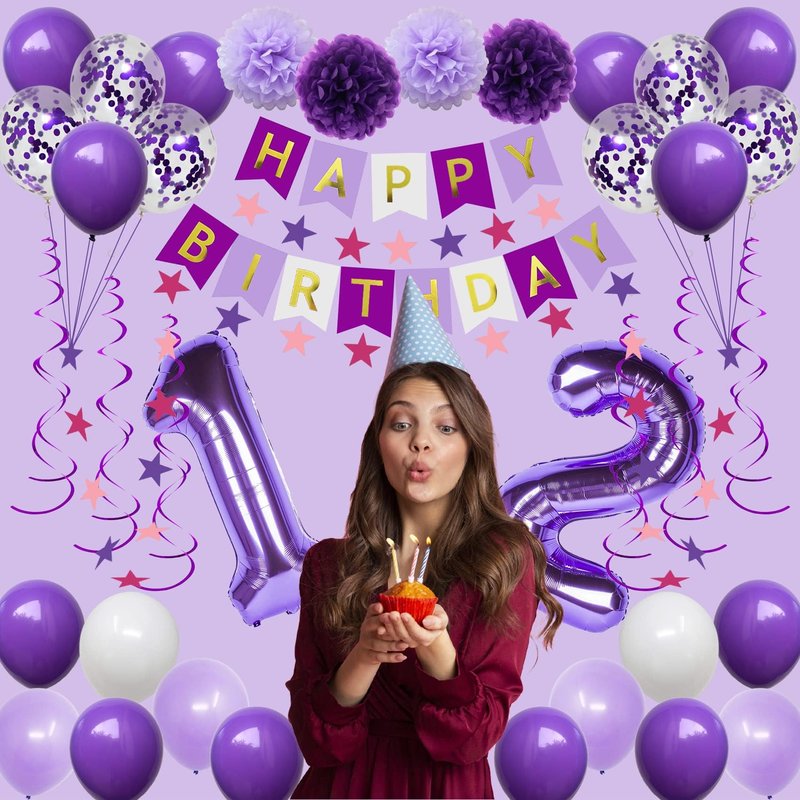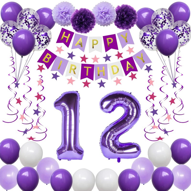 NANINUNENO 12th Birthday Decorations for Girls, Purple 12 Happy Birthday Balloons Supplies Including Purple Happy Birthday Banner, Purple 12 Number Balloons, Purple Pink Star Streamers, Hanging Swirls