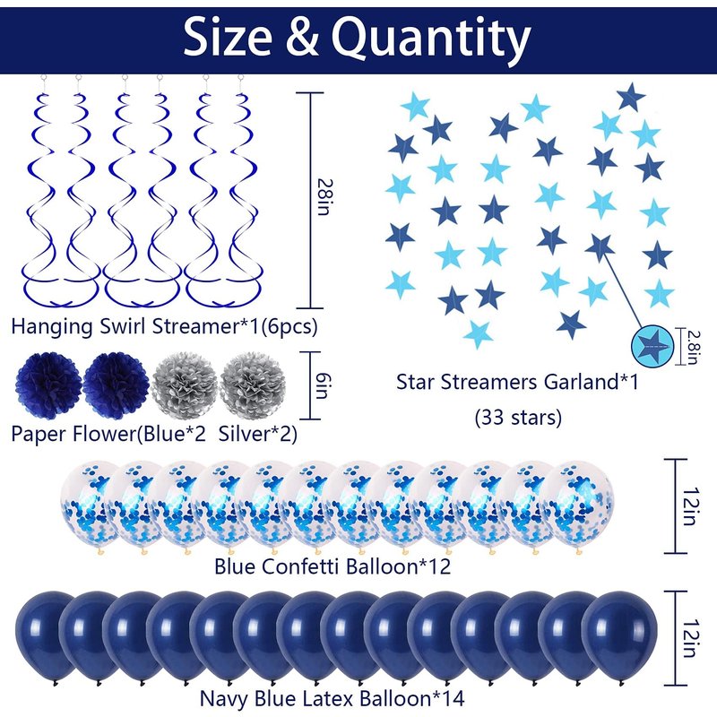 - ►WARM TIPS: The shiny star garland streamers consist of 33 blue or light blue stars, approximate 13 feet long, you can cut to 2-4 parts according to your needs; the twinkling hanging swirls set includes 6 double helix streamers, each about 28 inches; glitter effect confetti balloons need to be rubbed with your hair after inflated, all of which are easy to assemble