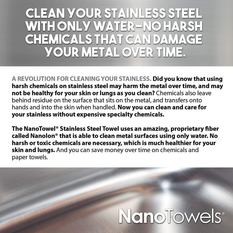 THE NANO TOWELS STAINLESS STEEL CLEANER REMOVES STREAKS, SMUDGES, AND FINGERPRINTS FROM ALL STAINLESS STEEL AND METAL SURFACES USING JUST WATER. Lift dirt, fingerprints, grease & grime like a magnet! The Nano Towels Stainless can clean almost ANY metal, but WON'T SCRATCH! Amazing for kitchens, bathrooms, garages, or anyplace that you have metal to clean and shine.SAFE FOR YOU, YOUR FAMILY, CHILDREN, PETS AND APPLIANCES. The Nano Towels Stainless eliminates the need for toxic chemicals. Get a clean home without the health dangers, using the Nano Towels Stainless. Safe for pets and loved ones. And won’t scratch stainless steel refrigerators, stoves, microwaves, or other appliances.