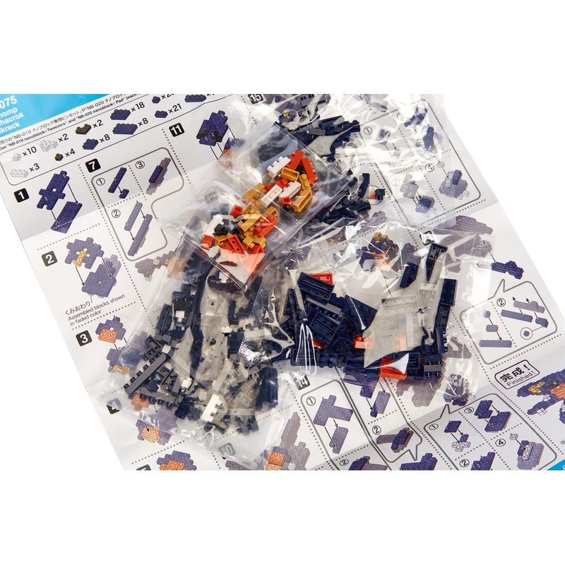 - Garchomp from Nanoblock's Pokémon Collection series stands approximately 2.4" tall and has 210 pieces