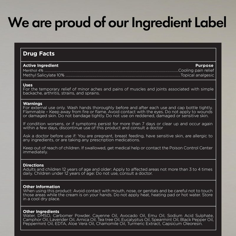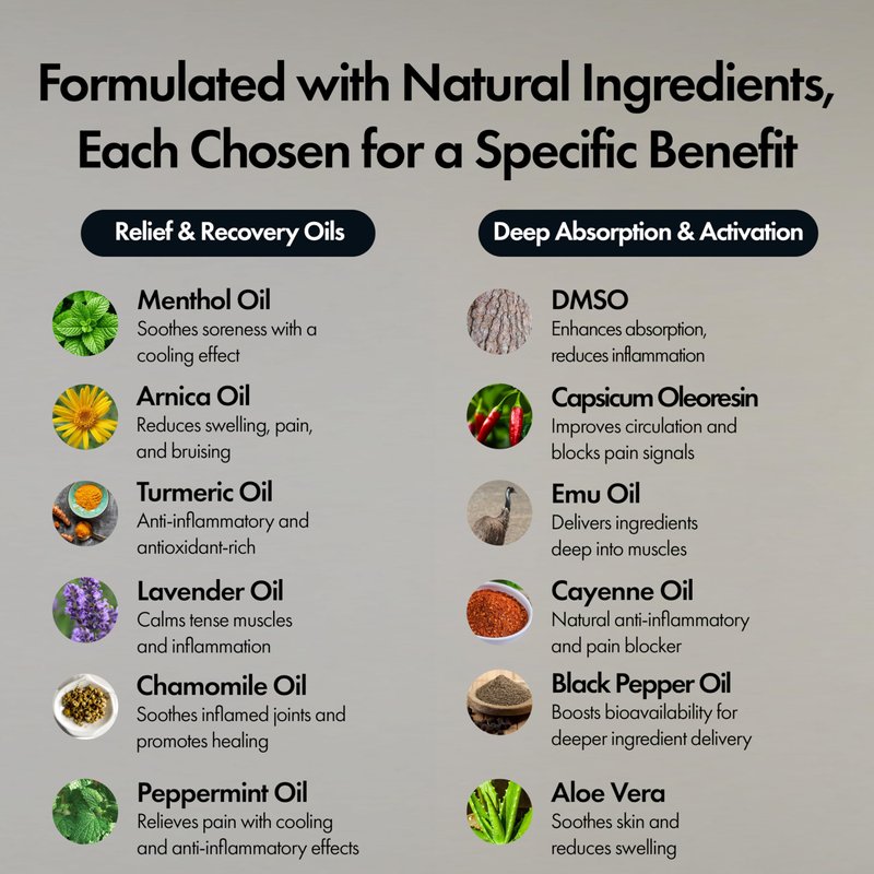 - NATURAL INGREDIENTS WITH PURPOSE: Formulated with 19 high-quality ingredients, each chosen for a specific benefit — like Arnica to reduce swelling, Menthol for a cooling sensation, and Capsicum to improve circulation and block pain signals.