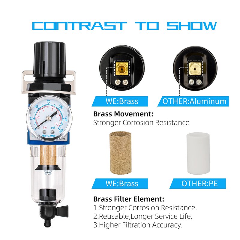 - This Air Filter Features a 5 micron Brass Filter Element for Excellent Filtering Performance, Longer Life, and Reuse Feasibility.