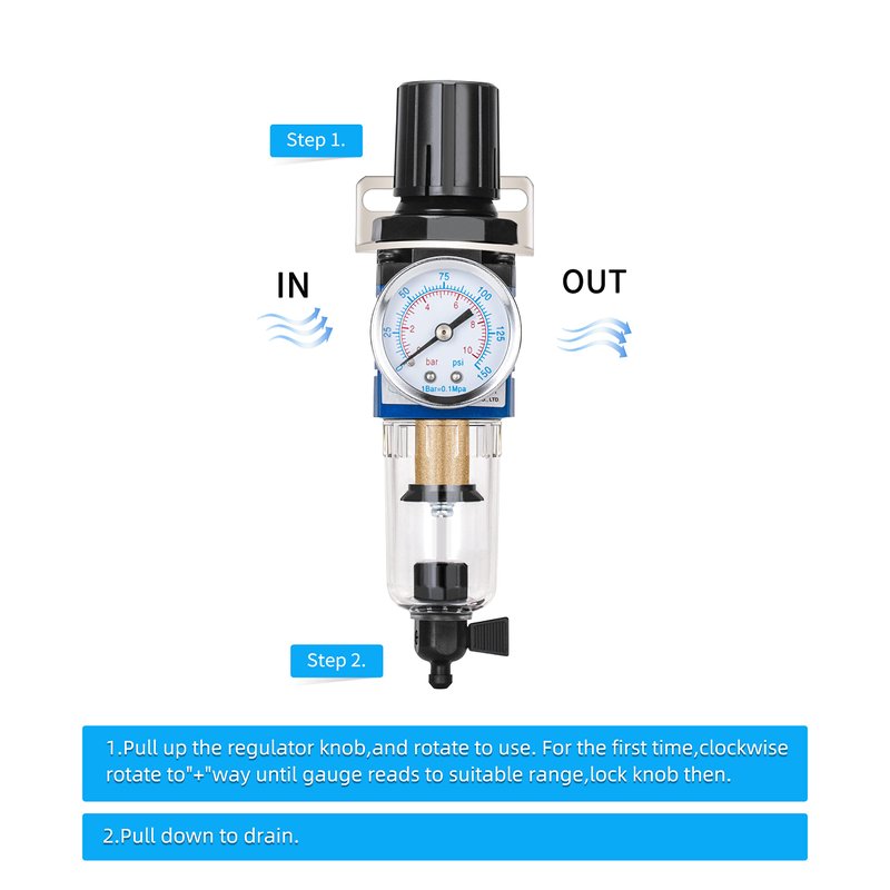 This air filter and regulator combo is easy to install and operate, with a manual drain function and a sturdy metal bracket for secure mounting. Whether you need to filter and regulate compressed air for your pneumatic tools, air compressors or other applications, the NANPU 1/4" NPT Compressed Air Filter Regulator Combo Piggyback is an excellent choice.