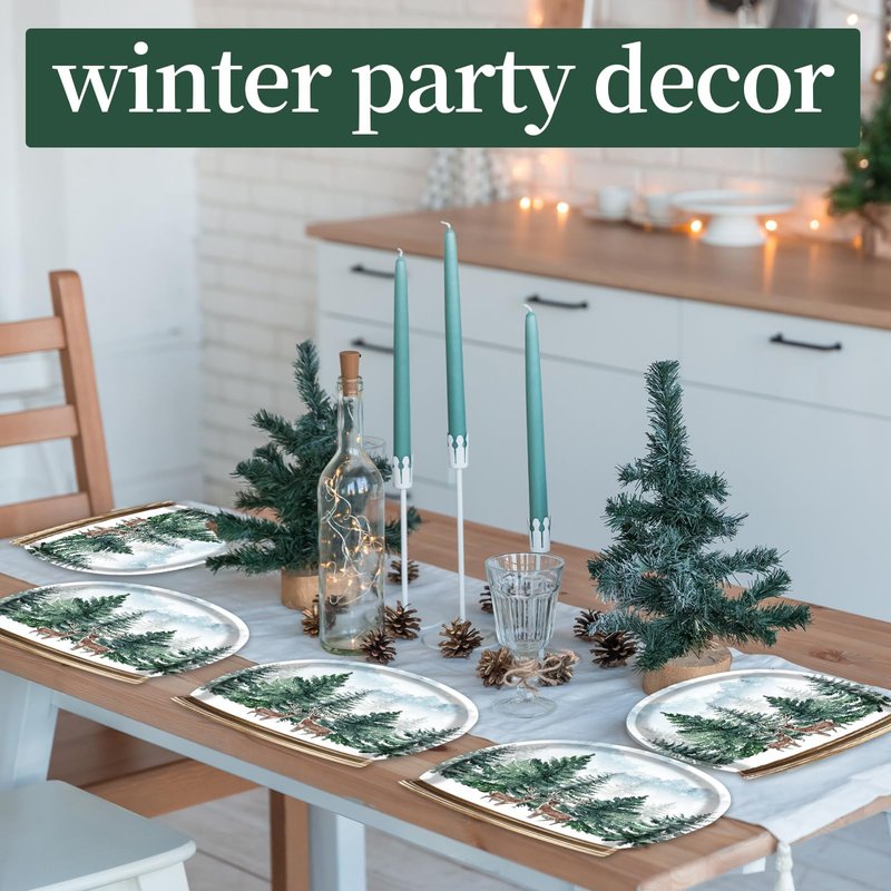 Naozinebi 50Pcs Winter Party Plates Winter Forest Tableware Set Party Decorations Xmas Tree Elk Disposable Paper Plates Crystal Ball Shaped Dinnerware Set for Christmas Holiday Party Supplies