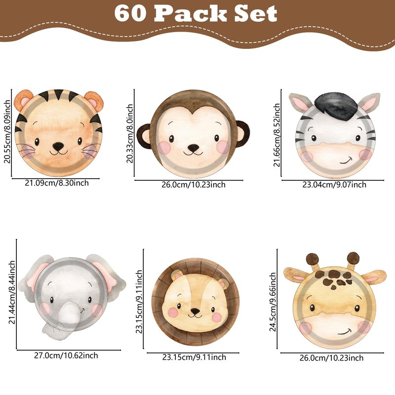 - Package include: you will get a set of 60 Jungle Safari animal themed shaped paper plates, including 10 plates each for tiger, monkey, zebra, elephant, lion, giraffe. It can accommodate up to 60 guests and is perfect for your party,it will add amazing to you, your family and friends.