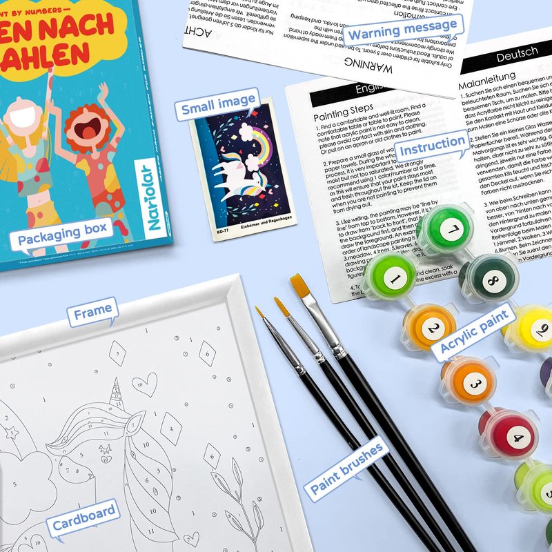 - Kid's Paint by Numbers Full Set: Nariolar makes sure the painting sets contain everything your child needs:1 pre-printed cardboard, 3 high-quality brushes, acrylic paint and 1 plastic frame, 1 instruction manual.
