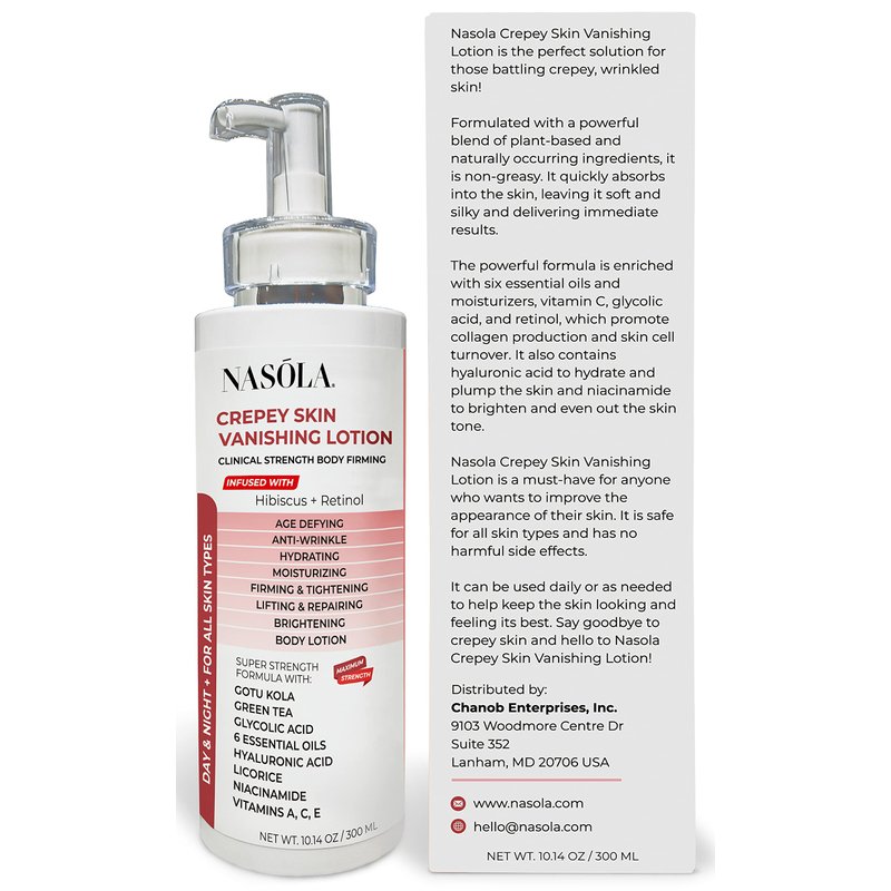 Crepe Erase Lotion: The Ultimate Solution for Dry, Aging Skin If you're struggling with dry, rough, and crepey skin on your body, then Nasola Crepe Erase Advanced Body Repair Treatment Lotion is here to help. This powerful moisturizer is specifically designed to target and improve the appearance of aging skin, leaving you with a smoother, firmer, and more youthful-looking body. Retinol and Hibiscus Work Together to Smooth and Firm the Skin Formulated with retinol and hibiscus, this advanced body repair treatment lotion helps to smooth and firm the skin, reducing the appearance of crepey, wrinkled skin. The natural plant extract hibiscus is known for its skin-loving properties, including its ability to improve skin elasticity and firmness. Retinol, a form of vitamin A, is a well-known anti-aging ingredient that helps to improve the appearance of fine lines, wrinkles, and uneven skin tone. A Moisturizing Blend of Vitamins and Green Tea In addition to retinol and hibiscus, this body repair treatment lotion is also infused with a blend of skin-loving vitamins, including vitamins A, E, and C. These vitamins help to nourish and hydrate the skin, while green tea helps to soothe and protect the skin from environmental stressors. 10.14 fl Oz of Skin-Loving Moisturization Each jar of Nasola Crepe Erase Advanced Body Repair Treatment Lotion contains 10.14 fl Oz for skin-loving moisturization. Whether you use it all over your body or as a targeted treatment for specific areas, this advanced body repair treatment lotion is a must-have for anyone looking to improve the appearance and health of their aging skin.