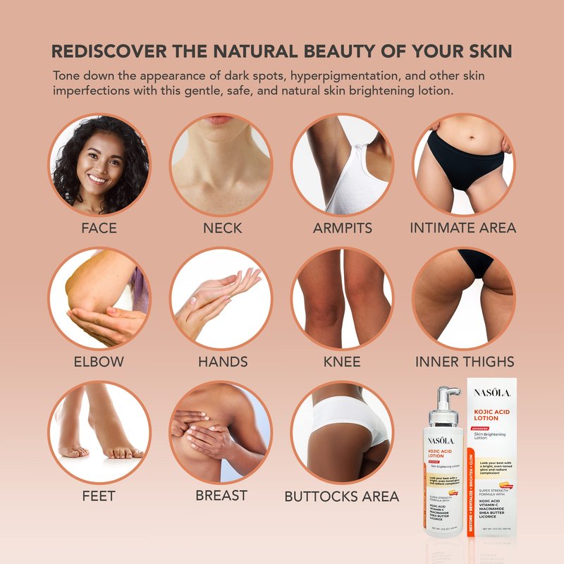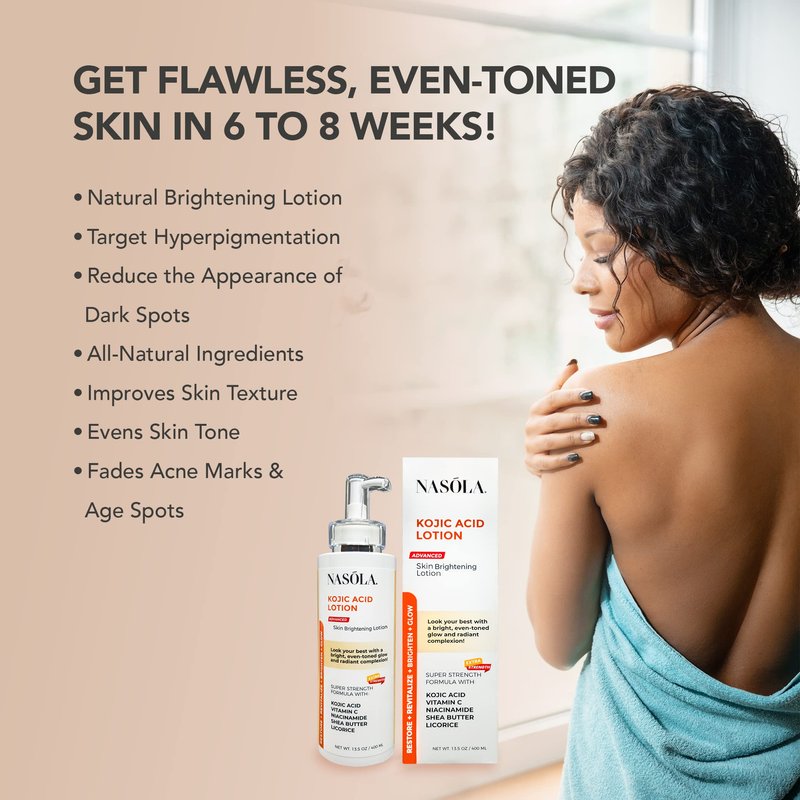- MOISTURIZE & GET YOUNGER-LOOKING SKIN - Experience a radiant, youthful glow with Nasola Kojic Acid Lotion. This gentle, safe, natural moisturizer and Shea Butter & Jojoba Oil infused body lotion revitalizes and refines the skin for a radiant complexion.