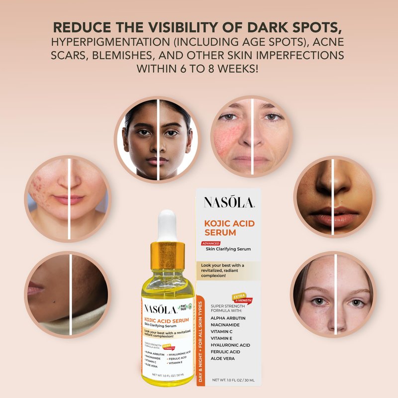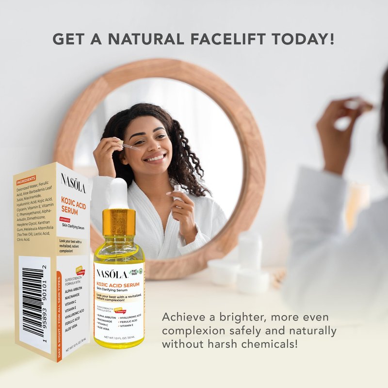 - CLARIFY & CLEAR - Nasola Kojic Acid Serum is a face serum for women and men formulated with naturally occurring ingredients such as Kojic Acid, Alpha Arbutin, Niacinamide, Vitamin C, Vitamin E, Hyaluronic Acid, Ferulic Acid, and Aloe Vera. Continuously use this original advanced complexion revitalization formula for radiant, youthful, and beautiful skin.