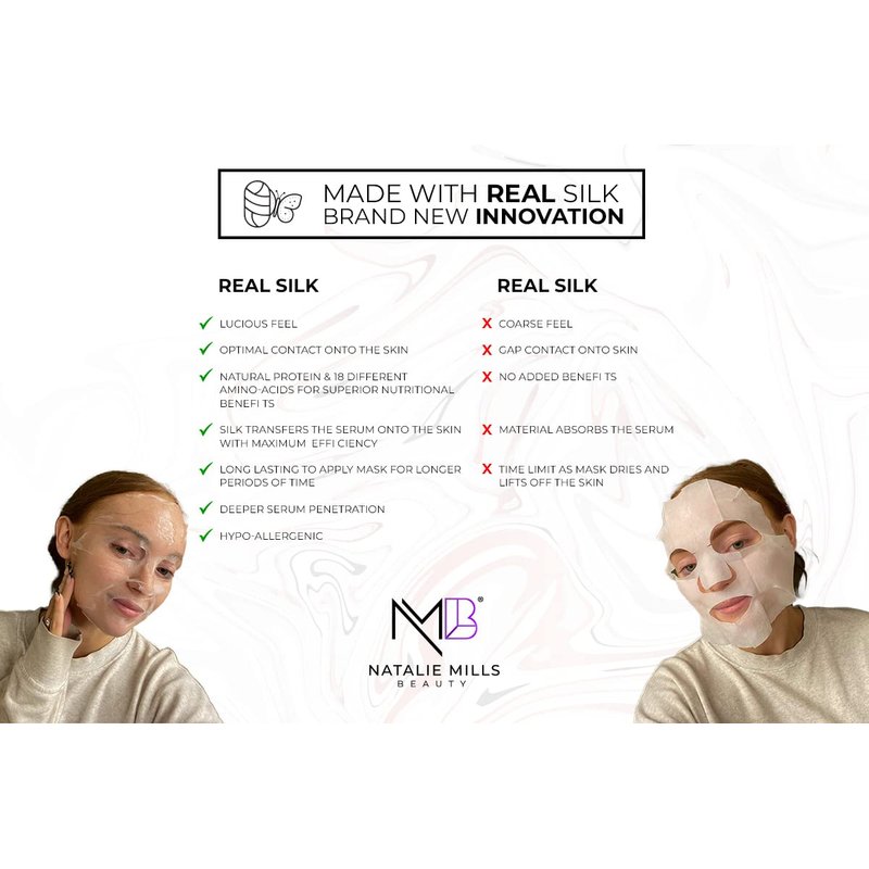 - This beauty mask is made with REAL SILK for a softer, luscious feel and optimal contact to the skin. The Silk transfers the nutrients & anti-aging properties of the serum onto the skin with maximum efficiency. The Silk contains natural protein & 18 different kinds of amino acids with superior nutritional benefits to the skin. Hypo-allergenic & suitable for all skin types.