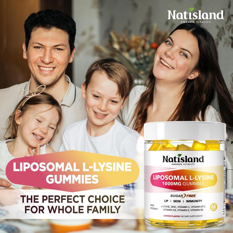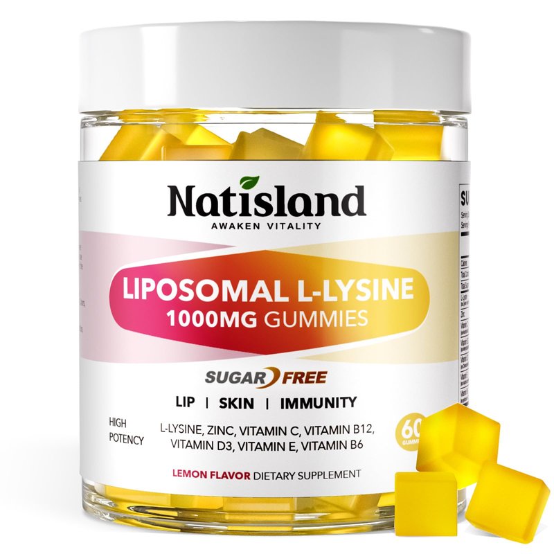 NATISLAND Liposomal L-Lysine Gummies 1000mg, Lysine Supplement for Adults & Kids, Chewable Lysine with Zinc for Lips & Oral Health, Immune & Collagen Support, Vegan, Sugar Free, Lemon Flavor, 60 Count