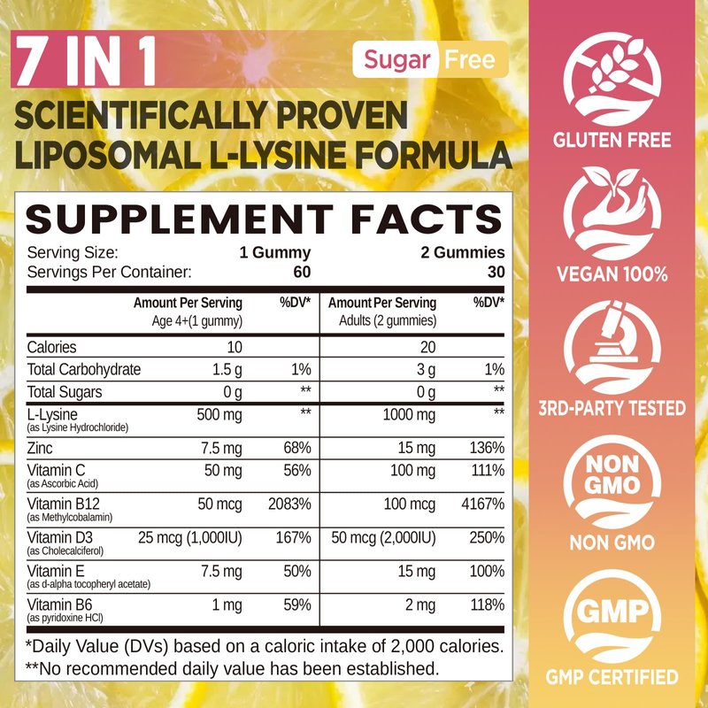 - L-Lysine 1000mg Gummies: Each 2 lysine gummies deliver 1000mg of l lysine to support healthy immune function, lips and skin wellness. Combined with zinc and vitamin c, b12, d3, b6 & e, our lysine chewable supplement provides a balanced formula for comprehensive wellness