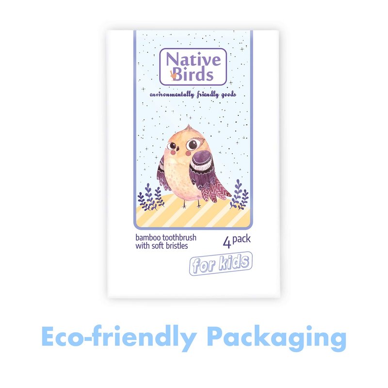 Native Birds Kids Bamboo Toothbrush with Soft Bristles, Set of 4 Eco Friendly Toothbrushes, BPA Free, Designed in Ukraine