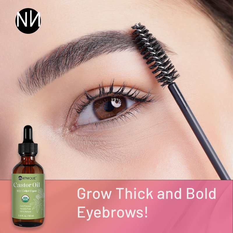 Natnique Castor Oil (2oz), USDA Certified Organic, 100% Pure, Hexane Free, Cold Pressed. Growth for Eyelashes, Eyebrows, Hair. Natural Skin Moisturizer & Hair Treatment. Eyebrow & Eyelash Brush