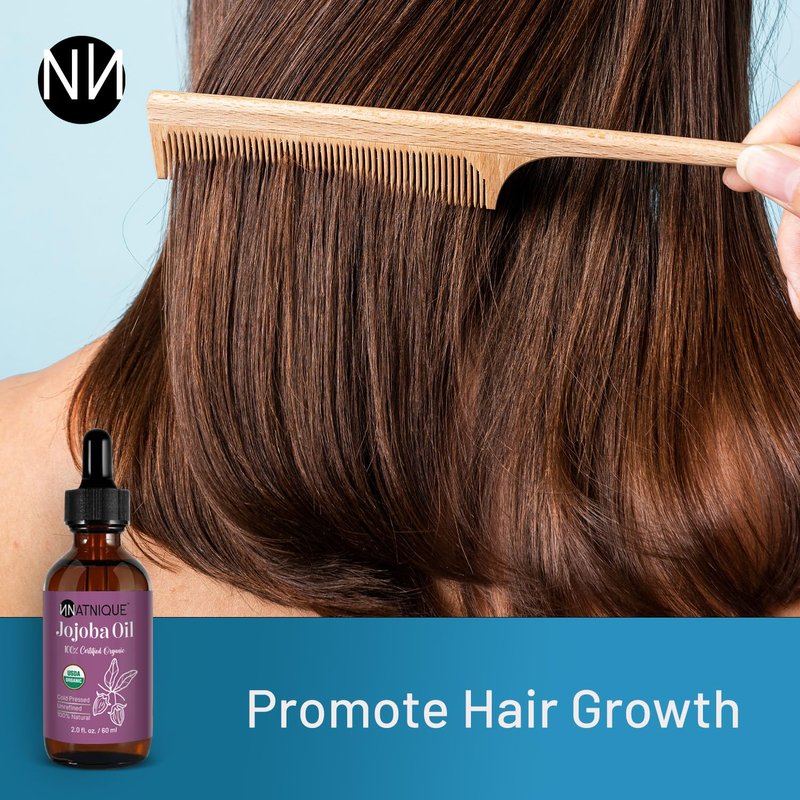 - JOJOBA OIL TO IMPROVE HAIR GROWTH – Natnique’s organic Jojoba oil is a perfect natural solution to grow longer and thicker hair. This oil is ideal to stimulate hair growth, treat dry brittle hair, dry scalps, and helps with dandruff. Can be used for all hair types.