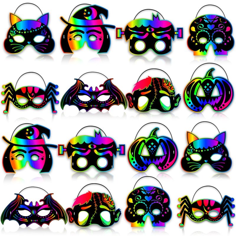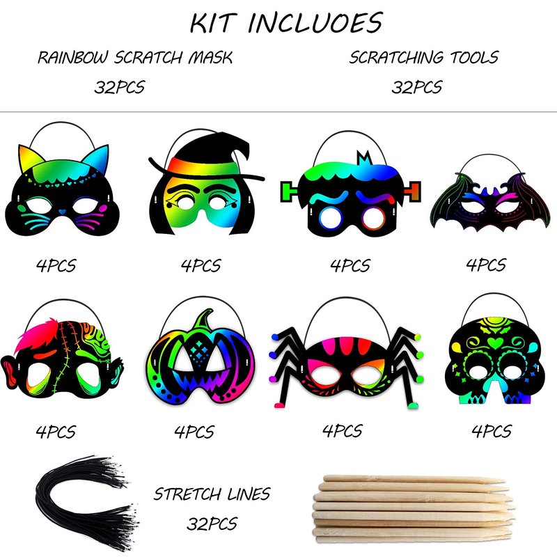 - PACKAGE INClUDES: 64 halloween crafts rainbow scratch mask (8 patterns), 32 strings, 32 wooden pens, and 2 sheets of rhinestones,ideal for birthday cosplay games, halloween activities, and more.