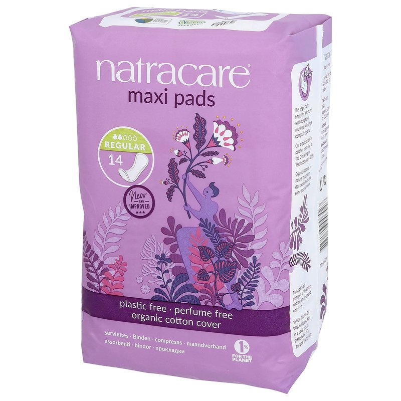 Natracare Natural Traditional Style Maxi Pads, Regular, Individually Wrapped, Without Wings in Plant-Based Bag (1 Pack, 14 Pads Total)