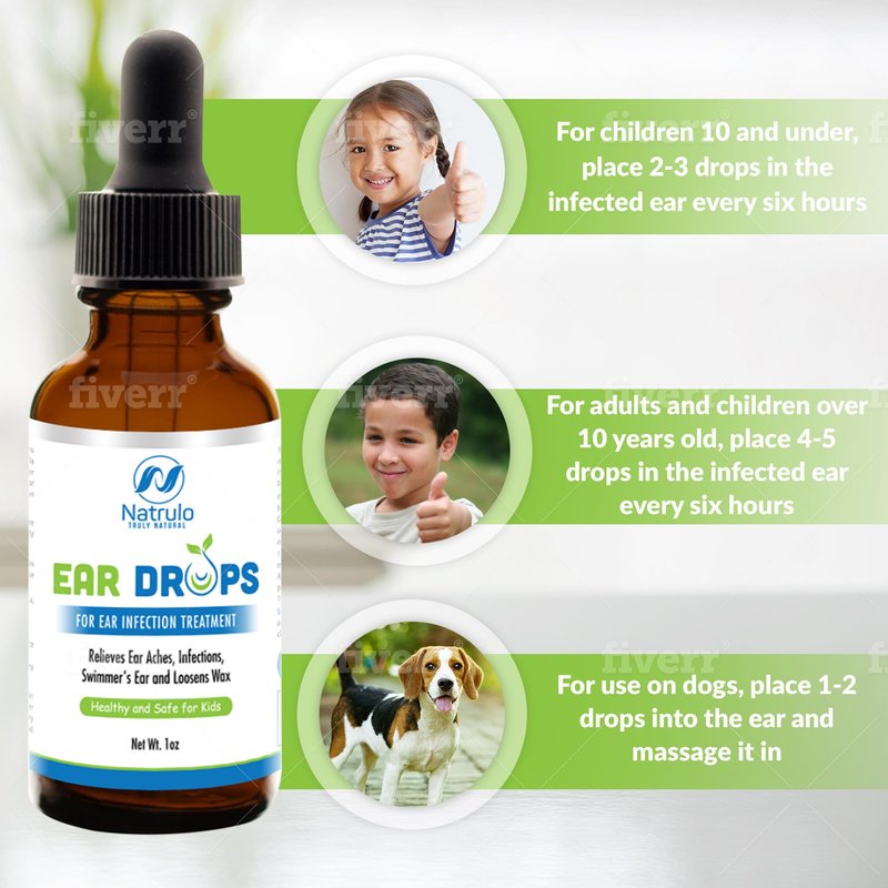 Directed Use: For children 10 and under, place 2-3 drops in the infected ear every six hours. For adults and children over 10 years old, place 4-5 drops in the ear every six hours. For use on dogs, place 1-2 drops into the ear and massage it in.