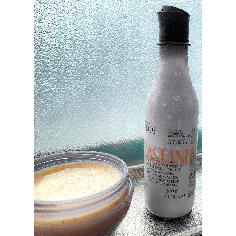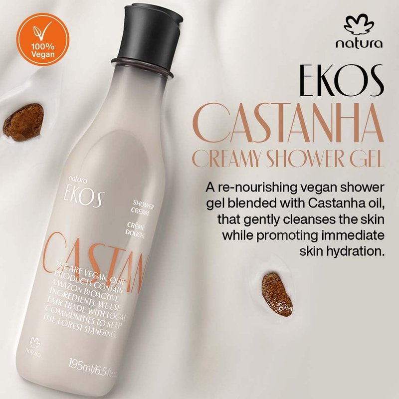 - Meet Ekos Castanha - A re-nourishing vegan shower gel blended with Castanha oil, that gently cleanses the skin while promoting immediate skin hydration. Delicately scented with a light creamy lactonic fragrance inspired by Castanha (Brazil nut) with a warm touch of amber and woody notes.