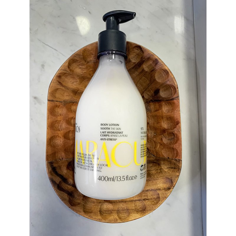 This body moisturizer is made with crude Maracujá oil. Hydrate, refresh, and rebalance skin immediately. Soften and improve skin texture in just 14 days. Rich in essential fatty acids with a light texture and quick absorption. Size: 400ml.