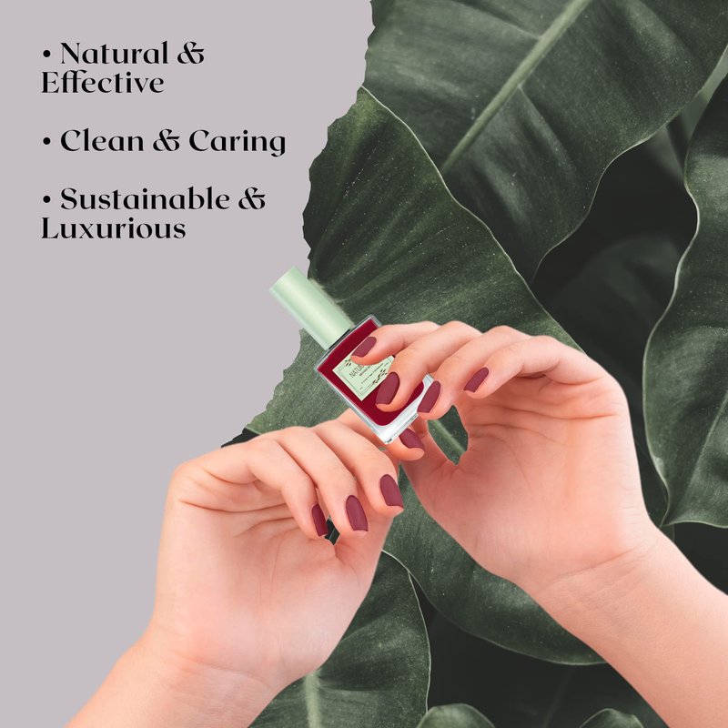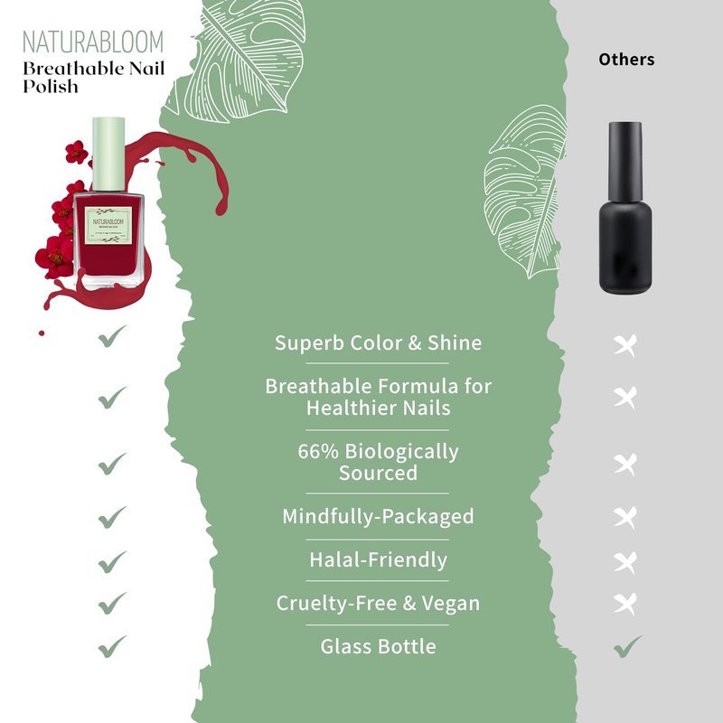 In today's world, it's not enough to simply follow fashion trends. Practicing conscious & mindful lifestyle habits is fundamental to a healthy beauty regime. That's why we provide you with 66% biologically sourced, breathable, vegan & Halal nail polish options that merge quality & mindfulness in one. With a PIR plastic cap and convenient glass bottle packaging, we strive to do our part in reducing the impact of cosmetics on the world at large. When you choose NATURABLOOM, you choose uncompromising luxury without the chemicals and guilt.