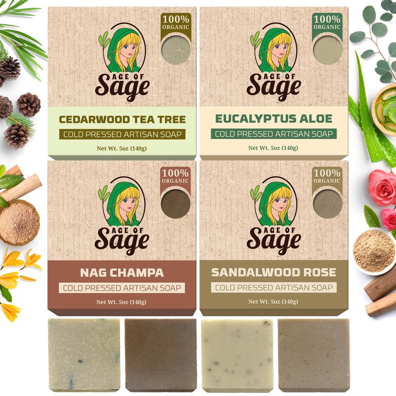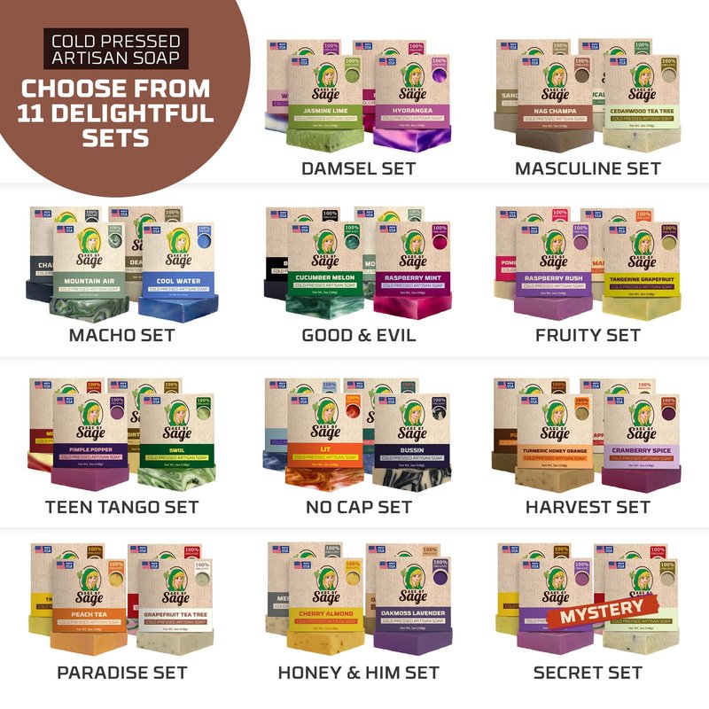 Age of Sage is the brand of choice for those few moments to yourself at the end of every day. Our unique, bespoke bar soaps for men and women are great for high-quality gifts, personal items, and home goods. We employ the cold process soap-making method mixed by hand in small batches to ensure the quality of the product. We're here to help you create a self-care space with various delectable scents. Our bundle scented soap-in-a-box comes in a pack of four variety bars with the same quality from the most all-natural soap bar ingredients that are moisturizing and easy on the skin. Our men's bar soap collection is infused with handcrafted vegan ingredients, including Coconut Oil, Canola Oil, Soybean Oil, Shea Butter, Water, Sodium Hydroxide (Lye), Olive Pomace Oil, Sunflower Oil, and Fragrance. Just add a ribbon, ready to go as a gift. Have this on Mother's Day, Birthday, Christmas, New Year's, Thanks Giving, House Warming, Holiday Gifts for Men and Women, or just-because pampering items to make that special person in your life feel special after a long work day. Rejuvenate your mind, body, and soul as Age of Sage lets you feel an excellent bathing experience with its Handmade Masculine Scent Bath Soaps. Each body bar soap offers a distinctive masculine-inspired fragrance that cleanses your skin while keeping it moisturized and nourished.