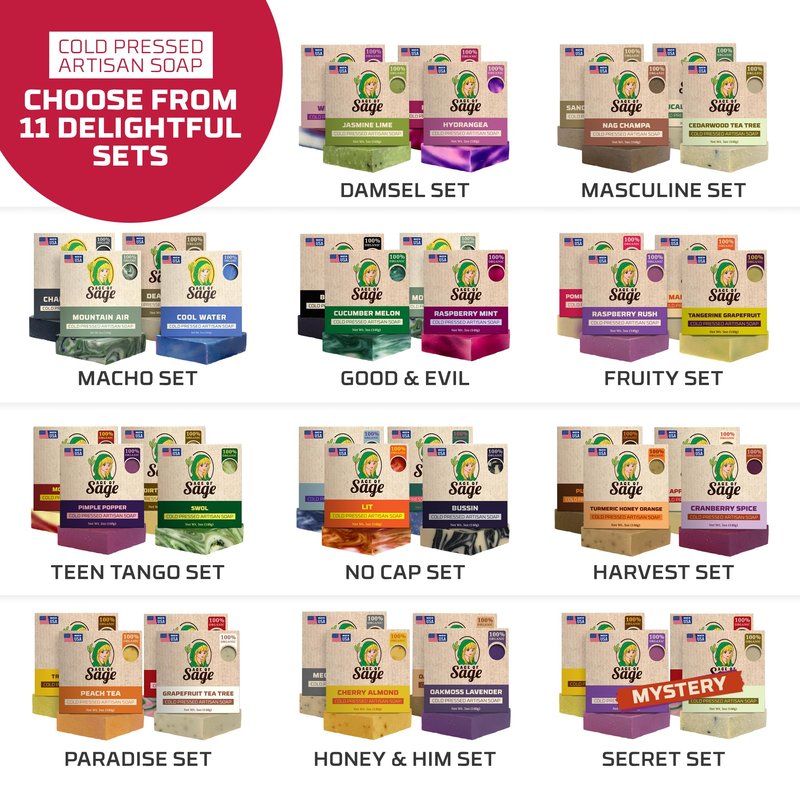 Age of Sage is the brand of choice for those few moments to yourself at the end of every day. Our unique, bespoke bar soaps for men and women are great for high-quality gifts, personal items, and home goods. We employ the cold process soap-making method mixed by hand in small batches to ensure the quality of the product. We're here to help you create a self-care space with various delectable scents. Our bundle scented soap-in-a-box comes in a pack of four variety bars with the same quality from the most all-natural soap bar ingredients that are moisturizing and easy on the skin. Our men's bar soap collection is infused with handcrafted vegan ingredients, including Coconut Oil, Canola Oil, Soybean Oil, Shea Butter, Water, Sodium Hydroxide (Lye), Olive Pomace Oil, Sunflower Oil, and Fragrance. Just add a ribbon, ready to go as a gift. Have this on Mother's Day, Birthday, Christmas, New Year's, Thanks Giving, House Warming, Holiday Gifts for Men and Women, or just-because pampering items to make that special person in your life feel special after a long work day. Rejuvenate your mind, body, and soul as Age of Sage lets you feel an excellent bathing experience with its Handmade Feminine and Masculine Scent Bath Soaps. Each body bar soap offers a distinctive feminine and masculine-inspired fragrance that cleanses your skin while keeping it moisturized and nourished.