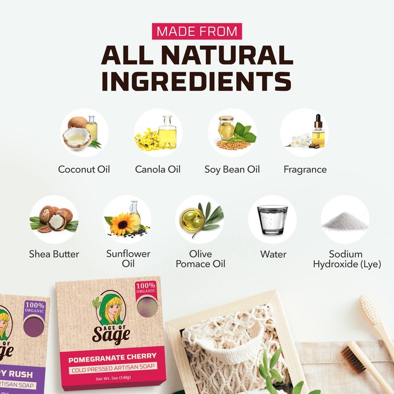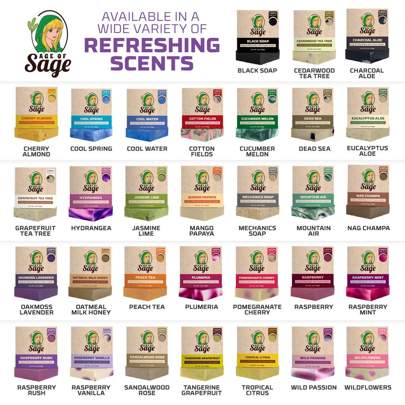 - WOMEN'S SOAP BAR FRUITY SCENT: Rejuvenate your mind, body, and soul as Age of Sage lets you feel an excellent bathing shower experience with its Handmade Fruity Scent women's bar soap. Each body bar soap is made with a distinctive natural soap for women or a fruity-inspired fragrance that cleanses your skin while keeping it moisturized and nourished.