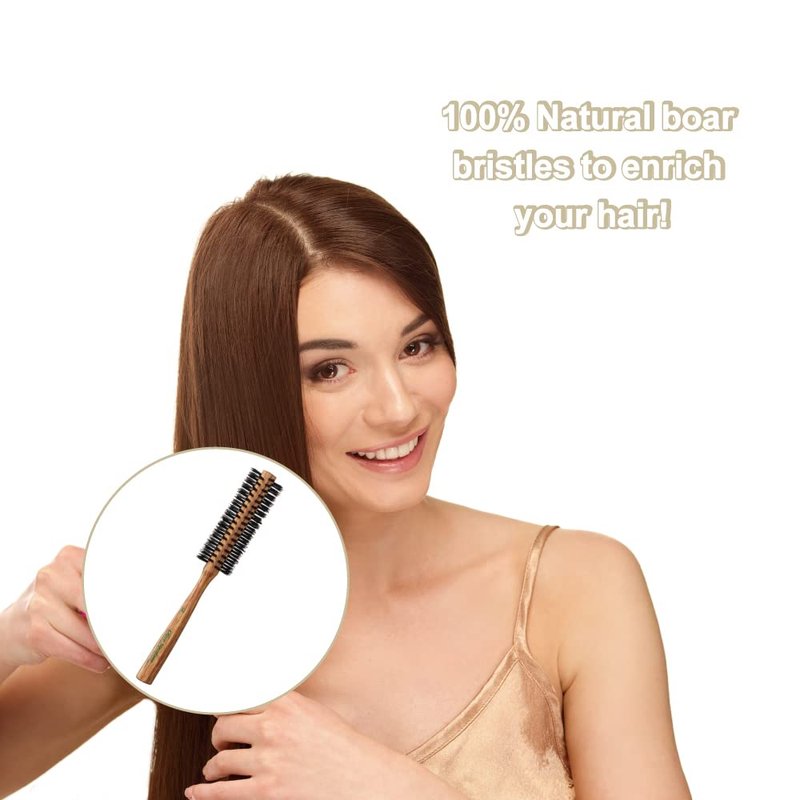 - [ Smooth and Rich ] 100% natural boar bristle is great for reducing frizz, enriching damaged hair, and adding shine and volume. The natural boar bristle round brush also works as anti static hairbrush due to its plastic-free bristles.