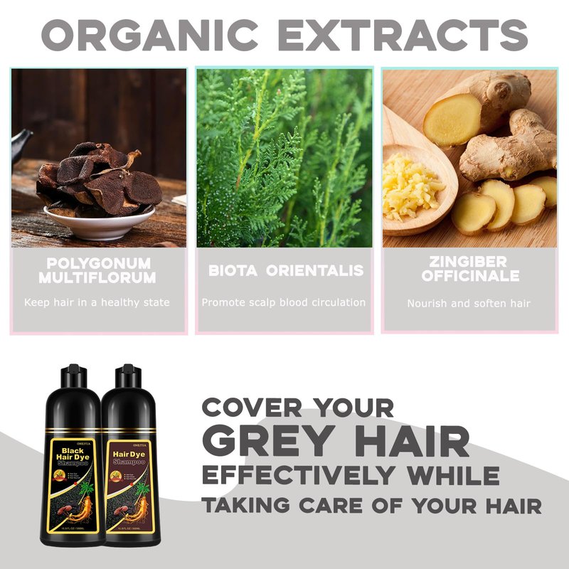 - NATURAL INGREDIENTS--Formulated with natural ingredients extracted from coconut oil, palm oil, olive oil, sugarcane and guava. The hair coloring shampoo is added with hair care essence extracted from polygonum multiflorum, biota orientalis and zingiber officinale, which can deeply infiltrate hair, strengthen the hair roots and make the hair strong and soft, nourish the hair strand and make the hair silky and shiny.