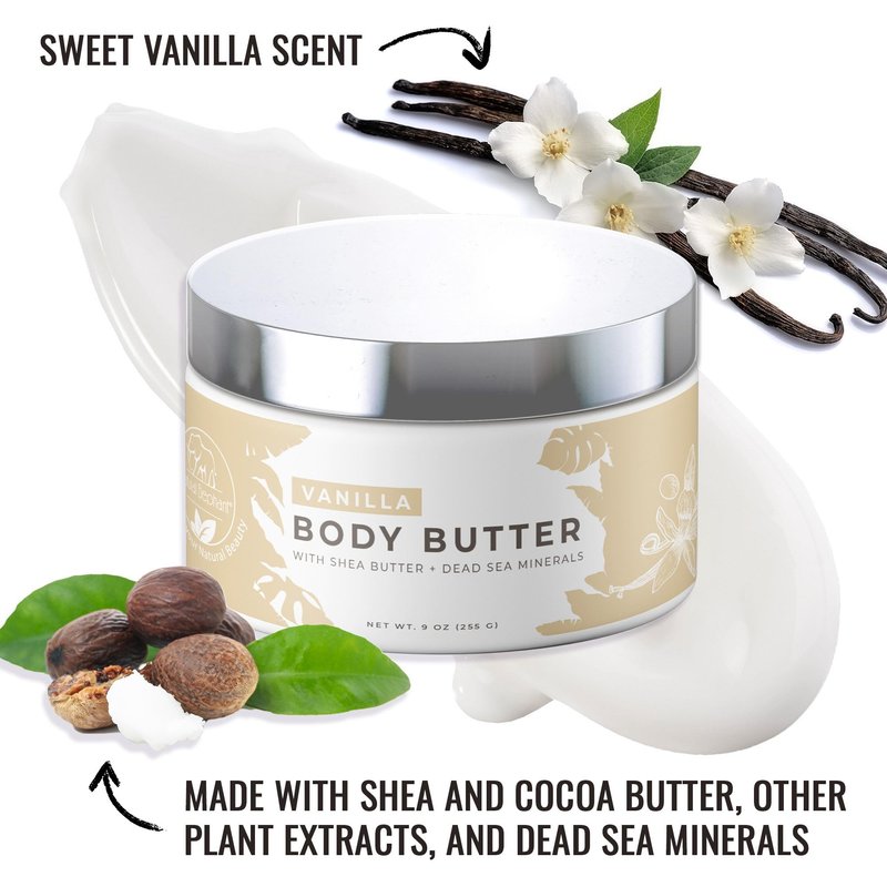 - Vitamins A and E Infusion: Enriched with vitamins A and E, this body butter helps to nourish and moisturize your skin. Dead Sea minerals complement this blend, contributing to a refreshed and revitalized look.