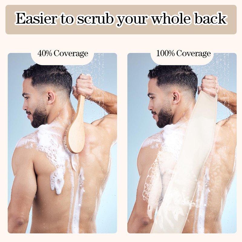 - Cleaning Your Back Made Easy: Our 4" X 31.5" long and wide design ensures thorough back exfoliation and cleansing. Reach every part of your back effortlessly with this shower scrubber, saving you the hassle of seeking assistance.