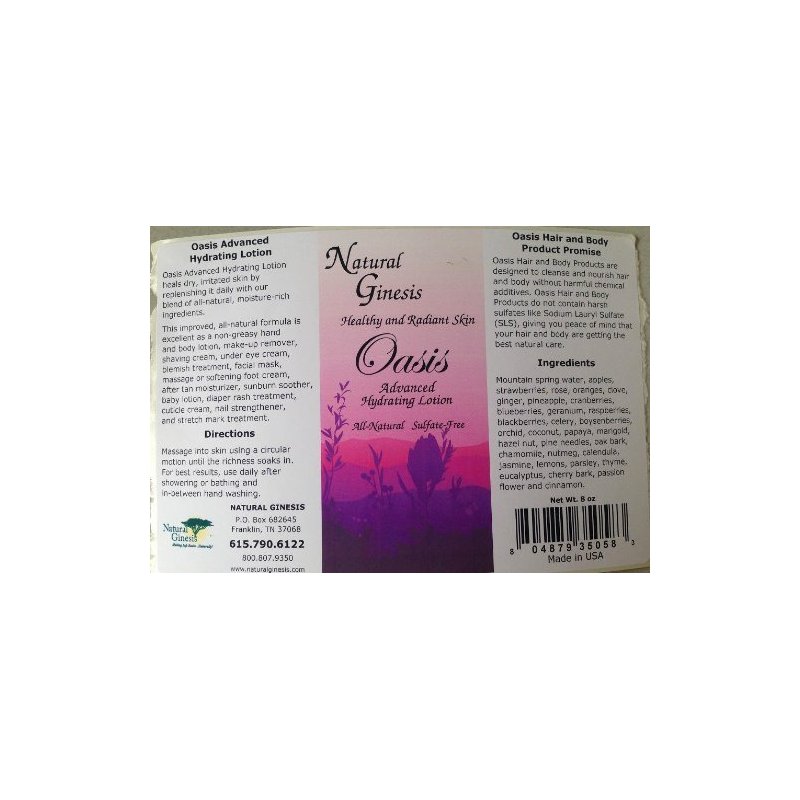 Oasis Advanced Hydrating Lotion heals dry, irritated skin by replenishing it daily with our blend of all-natural, moisture-rich ingredients. *For best results, use daily after showering or bathing and in-between hand washing. This improved, all-natural formula is excellent as: A non-greasy hand and body lotion Make-up remover Shaving cream Under eye cream Blemish treatment Facial mask Massage or softening foot cream After tan moisturizer Sunburn soother Baby lotion Diaper rash treatment Cuticle cream Nail strengthener Stretch mark treatment The Oasis Body Product Promise Oasis Body Products are designed to cleanse and nourish the body without harmful chemical additives. Oasis Body Products do not contain sulfates, including Sodium Lauryl Sulfate (SLS), giving you peace of mind that your body is getting the best natural care. *Please note that Oasis products do NOT help with mites, scabies, lice, or any other infestation problem. For help with these and other bug problems, please see our Kleen Green products.