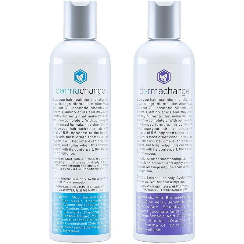- Repair damaged hair with DermaChange Shampoo and Conditioner Set! Infused with natural & organic ingredients including aloe vera, coconut oil & orange peel oil, this organic shampoo & hair conditioner not only gets rid of dry scalp & dandruff but also rejuvenates weak, thin & damaged hair to keep them strong, smooth & healthy!