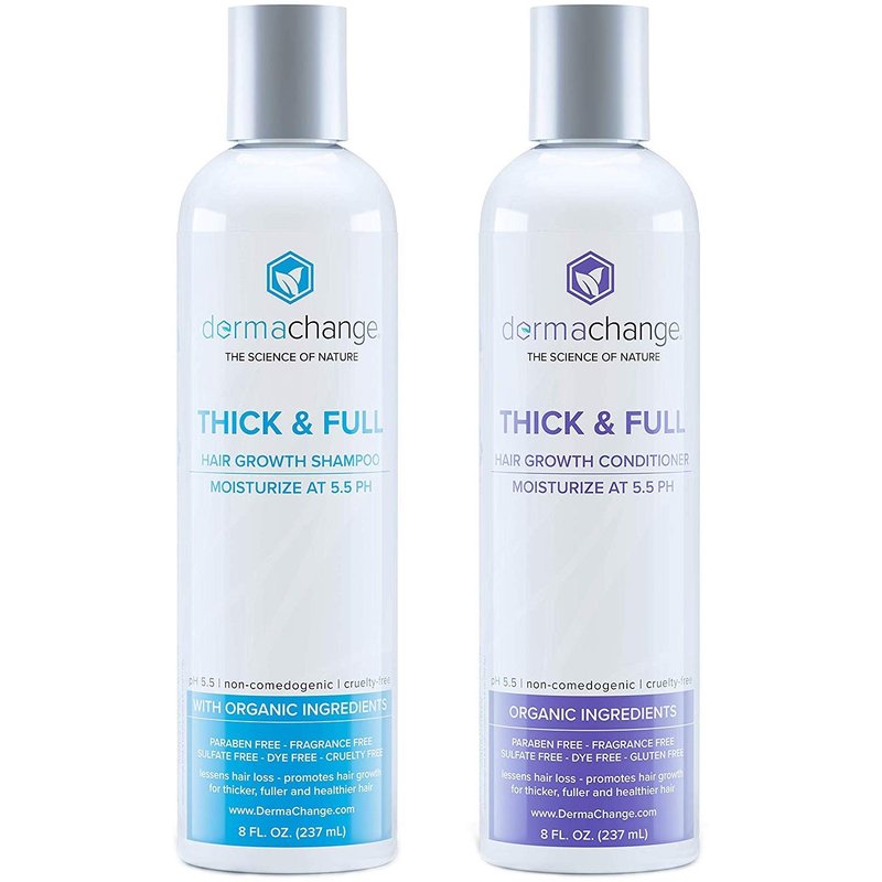 - DermaChange travel shampoo and conditioner set is ph-balanced to match your skin’s pH level to clean out the buildups caused by commercial styling and hair products without stripping off the protective layer of your hair & scalp. Our hair loss shampoo and conditioner replenishes lost nutrition that's vital in keeping hair full-bodied, strong & healthy!