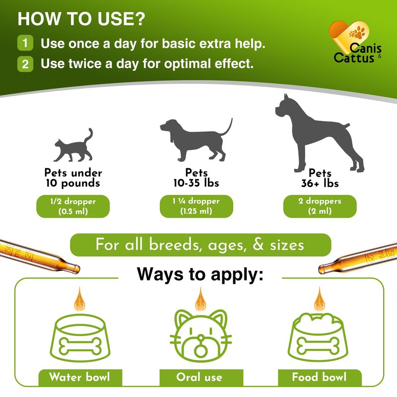 HOW TO USE: Add into a water or food bowl, directly in to the mouth or topically. Use from once to twice a day.