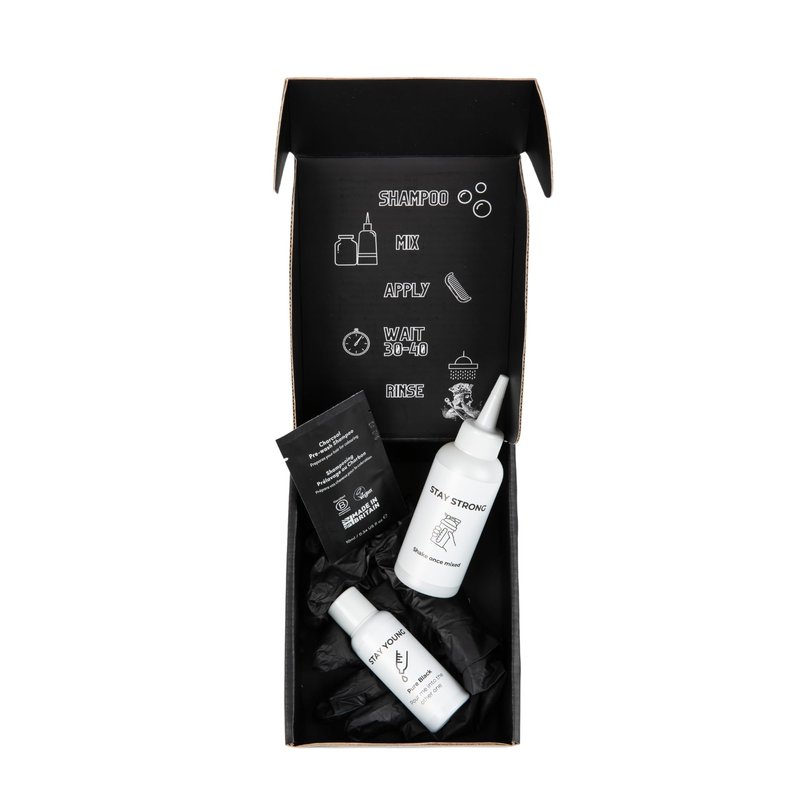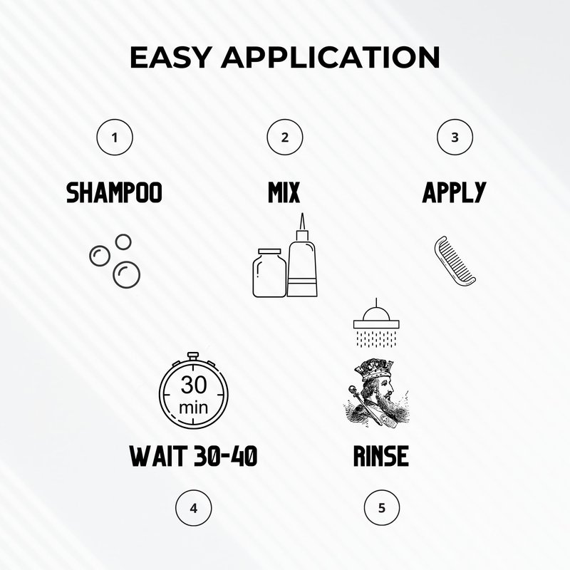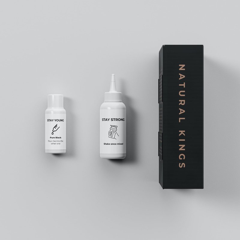Step into a world where your hair commands as much respect as your persona with Natural Kings Men’s Hair Dye. Our uniquely potent formula not only covers gray hairs but also transforms them into a rich, deep color that's as vibrant as the man applying it. Every application promises not just a color change but a bold, unapologetic transformation that invites you to take on the world. Natural Kings is more than just a hair dye. It's a declaration of strength and style, designed to harmonize with your natural hair for a look that’s both powerful and natural. This easy-to-use formula can be applied in the comfort of your own home, ensuring a clean process and a stunning result in less than an hour. The blend acts fast to deliver consistent, full coverage, revitalizing your look and preparing you to seize each day with newfound confidence. Enhance your daily grooming ritual with Natural Kings – where every dye application is a step towards the throne of your daily life. Includes: 1 activator bottle (1.70 US fl oz), 1 color gel bottle (1.70 US fl oz), 1 charcoal shampoo sachet (.34 US fl oz), 1 pair of black vinyl gloves