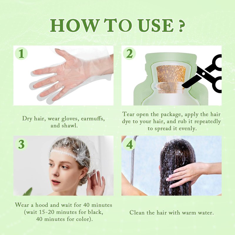 - 【How to use】1. Dry hair, wear gloves, earmuffs, and shawl. 2. Apply the product evenly to the hair, and rub it repeatedly to ensure that every hair is evenly coated. 3. Wear a hood and wait for 40 minutes (wait 15-20 minutes for black, 40 minutes for color), wash with clean water and blow dry.