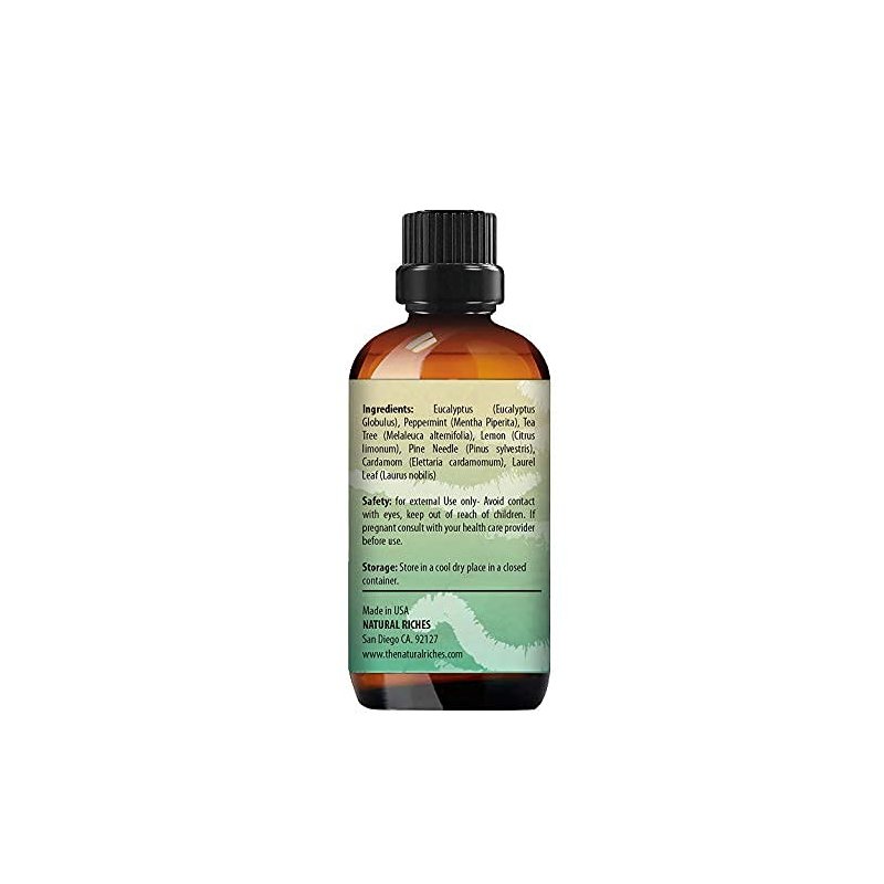 Eucalyptus, Peppermint, Tea Tree, Lemon, Pine Needle, Cardamom and laurel Leaf effectively work together as an excellent blend to promote clear breathing. "This Natural Riches Essential Oil blend contains the best ingredients available. We have combined them using superior processes of distillation and bottling, thus developing the best quality synergy blend." SAFETY WARNING: For external use only. Other than aromatherapy, dilute with a carrier oil. For topical use, rub a very small amount on the inside of your elbow area to test for any allergic reaction before use. Keep out of the reach of pets. Avoid contact with eyes, keep out of the reach of children. If pregnant, consult with your health care provider before use. *FDA DISCLAIMER: These statements have not been evaluated by the food and drug administration. This product is not intended to diagnose, treat, cure or prevent any disease.