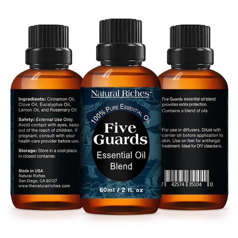 - Natural Riches Five Guards Essential Oil Blend is based on the tales of four French thieves who survived the plague by covering themselves with cloves, rosemary, and other aromatics oils while robbing people during the plague. Strong defense against harmful agents. Immunity Support Essential oil blend.