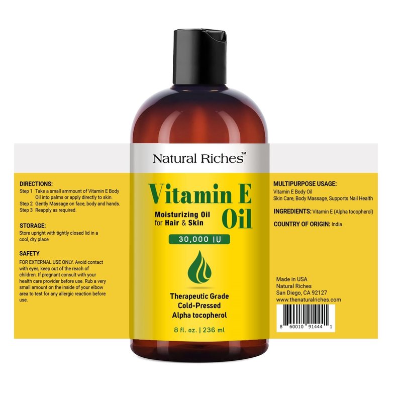 - Multi-Purpose: Natural Riches pure Vitamin E oil has multiple purposes. It can be used for body massages, skin care, hair care and nail health. It may help achieve skin's youthful look and help rejuvenate skin by regeneration