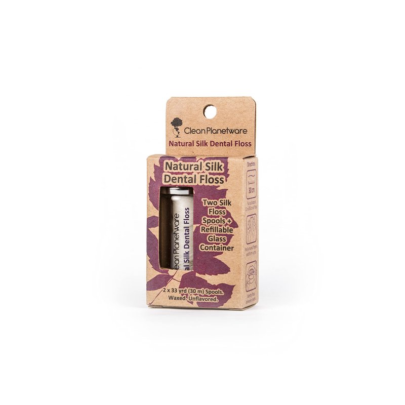 Our silk floss coated in candelilla wax is an environmentally-conscious alternative to plastic dental floss. 2 Silk Floss Spools (33 yrds / 30 m each) + 1 Refillable Glass Container. Pure Silk Thread with Candelilla Wax. Unflavored. 100% Home Compostable Product and Packaging.