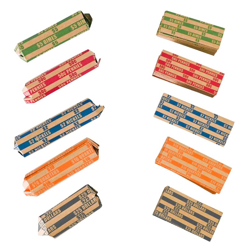 - 500 Assorted Flat Coin Rolls Wrappers (100 Each of Quarters, Dollars, Dimes, Nickels, Pennies).