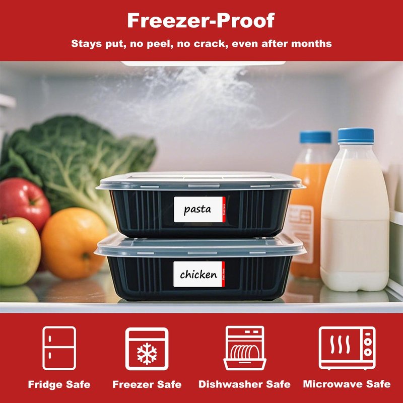 - Freezer-Resistant: Freezer labels feature a strong adhesive designed to prevent peeling in low temperatures; they are waterproof, oilproof, tear-resistant, and can withstand fridge/freezer/dishwasher/microwave use