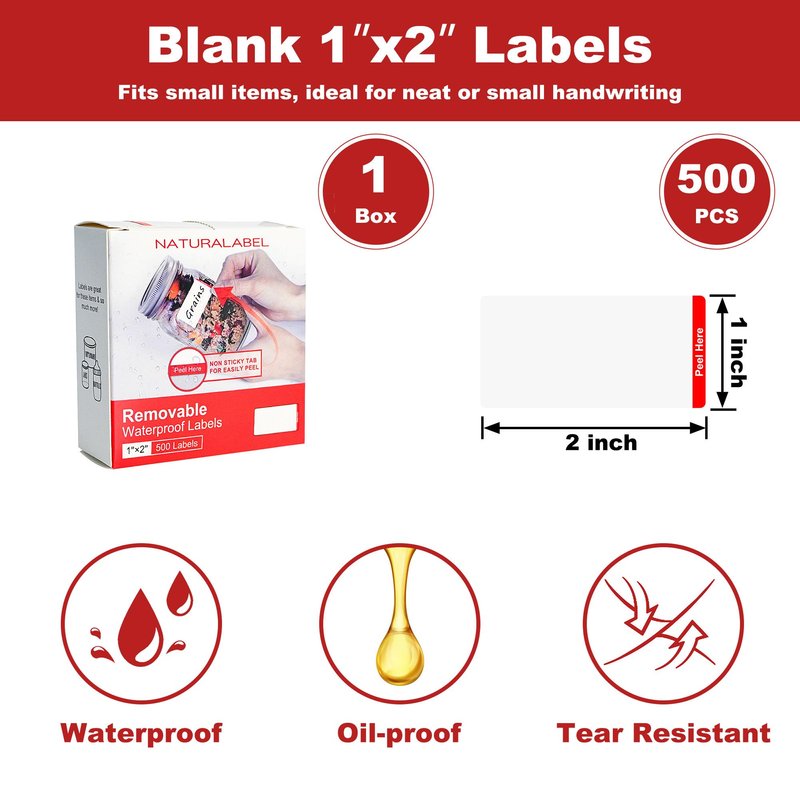 NATURALABEL 500 PCS Blank Removable Freezer Labels with Dispenser - 1" x 2" Food Labels for Meal Prep Containers & Pantry Organizers, Easy Peel-Off Design, No Residue