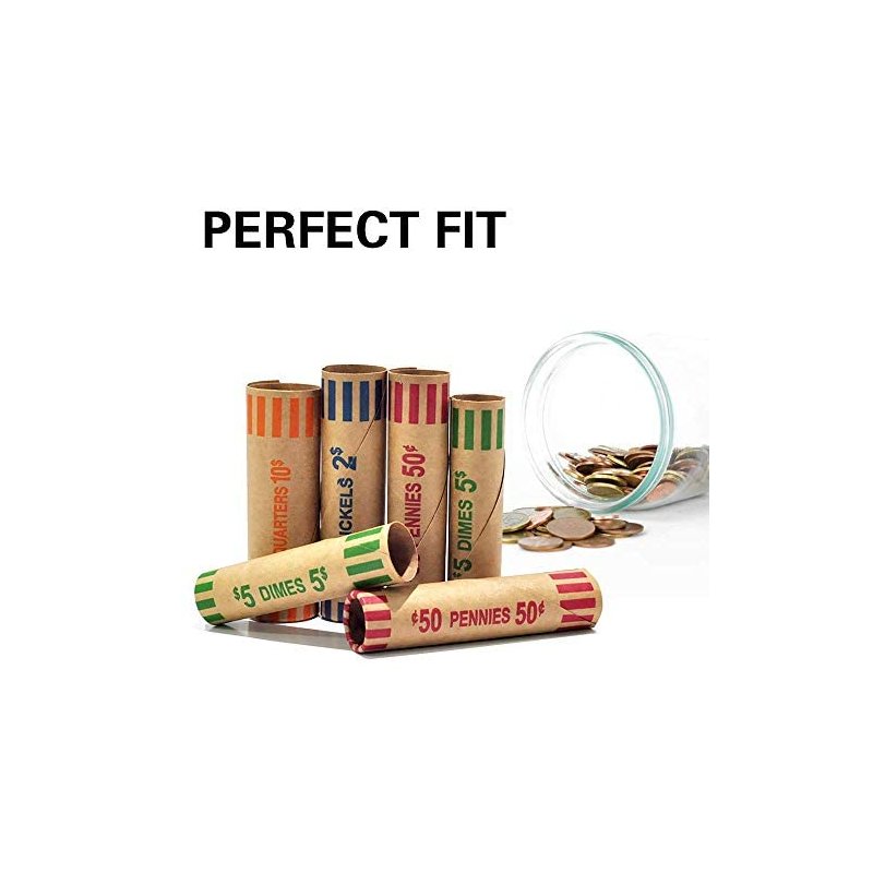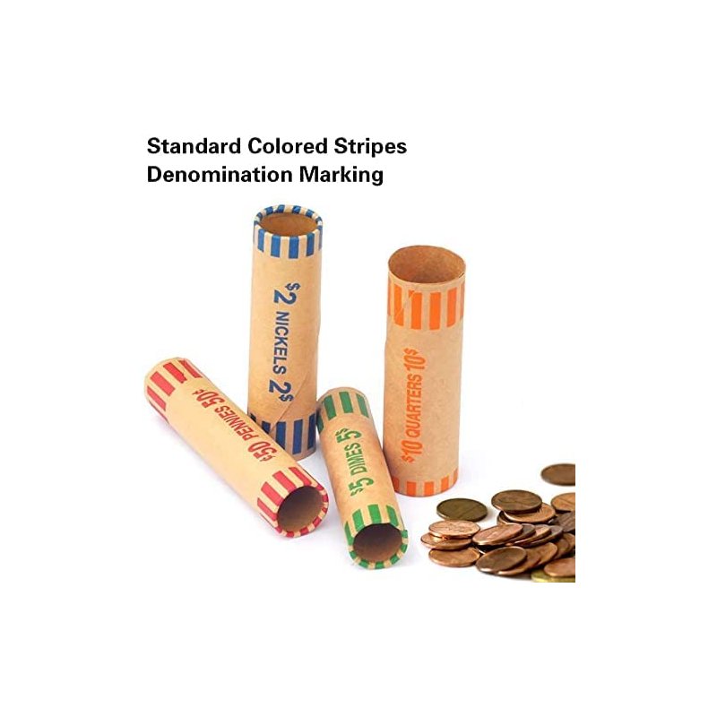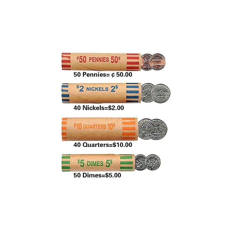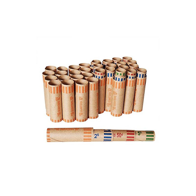 Coin wrappers packaging: 32 Quarters, 16 Pennies, 16 Nickels and 16 Dimes. With this Coin Wrappers Packaging, you can quickly organize a large number of coins. Easy to use: Put the coins in the coin package straight through for easy storage and use. Features: Easy to sort and store coins. Material: Use high-quality kraft paper