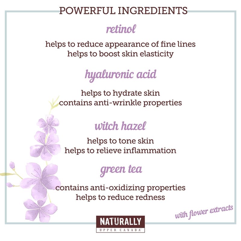 - REJUVENATE: Infused with retinol, hyaluronic acid, witch hazel and rose to help smooth, firm and tighten to reduce the appearance of fine lines and wrinkles.