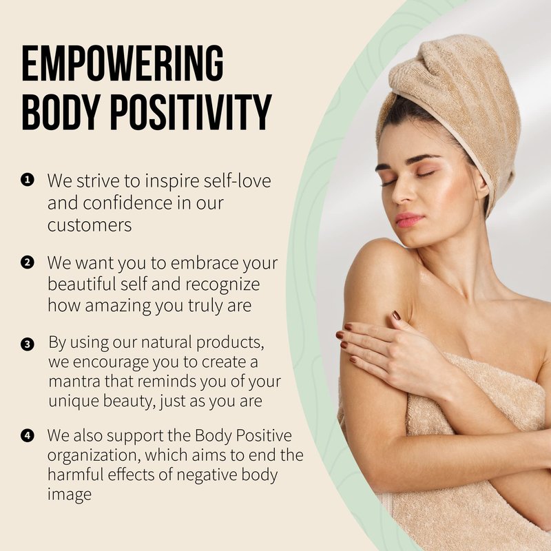 - EMPOWERING BODY POSITIVITY: We strive to inspire self-love and confidence in our customers; We want you to embrace your beautiful self and recognize how amazing you truly are; By using our natural products, we encourage you to create a mantra that reminds you of your unique beauty, just as you are; We also support the Body Positive organization, which aims to end the harmful effects of negative body image